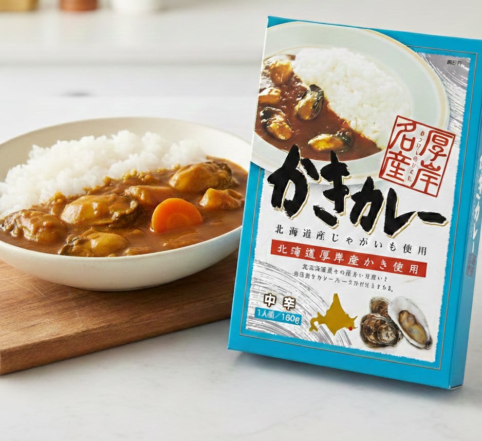 厚岸特産の牡蠣が入ったご当地カレーシリーズの火付け役。レトルトパウチで温めるだけの簡単調理。海のミルクと呼ばれる「牡蠣」が入ったカレーは特製ルーとも相性抜群です。